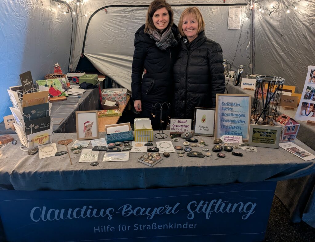 Unser Stand war am 29. und 30. November aufgebaut, dieses Mal im Rondell um das Karussell. Neben selbstgestaltete Weihnachtskarten und Karten zu besonderen Anlässen gab es wieder mit der Dotting-Technik verzierte Büchlein und Steine zu kaufen. Erstmals wurden von Theresa sehr aufwendig gesammelte und verarbeitete Baumperlenarmbänder und -ketten verkauft. Ein ganz besonderer Dank an dieser Stelle für die geduldige Handarbeit! Der gesamte Erlös aus dem Verkauf der handgemachten Artikel sowie die erhaltenen Spenden kommen zu 100% unseren Straßenkinderprojekten zugute.